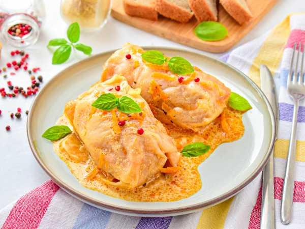 Закройте сковороду крышкой, доведите до кипения, уменьшите огонь и тушите голубцы с бурым рисом и фаршем до готовности, примерно 30-40 минут.