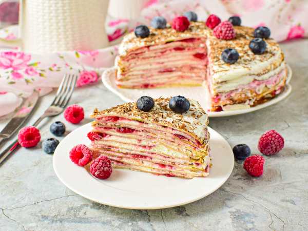 Так соберите блинный торт. Уберите его в холодильник на 2-3 часа, чтобы он настоялся. Готовый блинный торт с кремом чиз и ягодами украсьте на свой вкус.