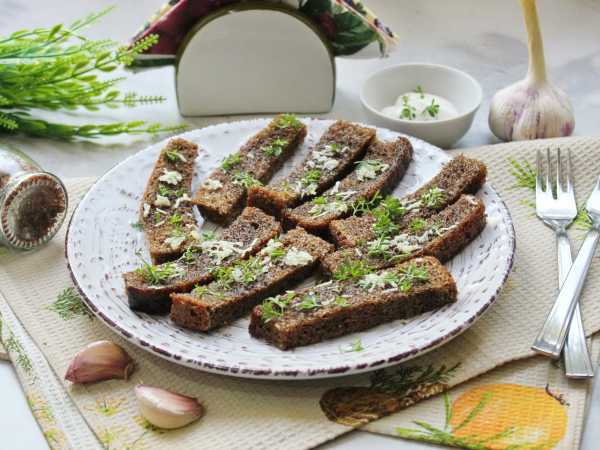 Распределите чесночную массу по ломтикам хлеба. Оставьте на 5–7 минут. Если вам покажется, что ломтики хлеба суховатые, смажьте их дополнительным количеством чистого растительного масла. Запекайте чесночные гренки из бородинского хлеба около 10-15 минут в разогретой до 200 градусов духовке. Они должны подрумяниться сверху, но внутри остаться мягкими.
