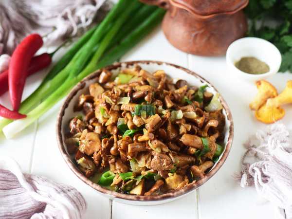 Затем отожмите лисички, если использовали размороженные. Нарежьте их и добавьте в сковороду. Обжарьте все еще 4-6 минут. Грибы выделят небольшую часть жидкости и потом начнут обжариваться.