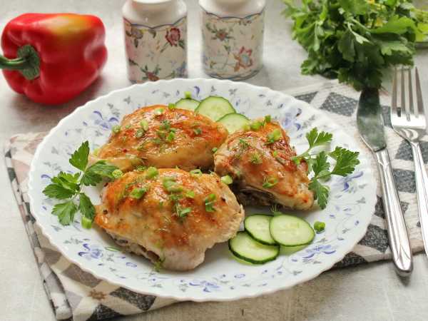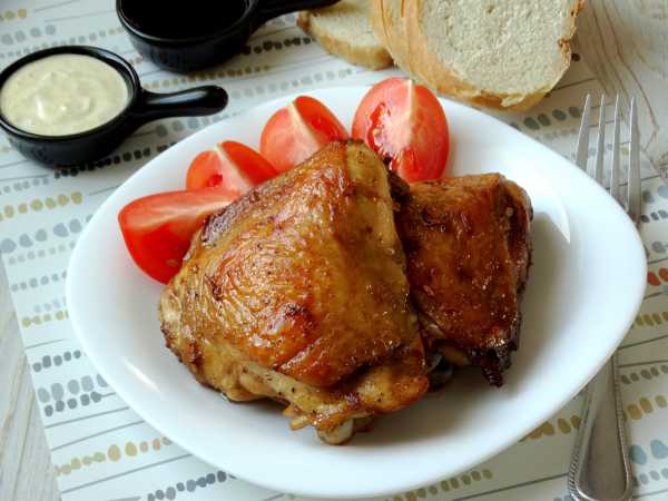 Ароматная курица, запеченная под сметаной, получается нежной и сочной. Желательно, натереть куриные бедра солью и перцем хотя бы за полчаса до приготовления, чтобы мясо просолилось. Подавайте такую курицу с любым гарниром или салатом из свежих овощей.