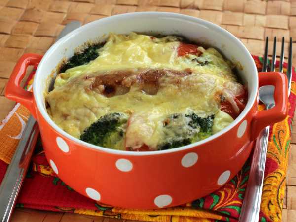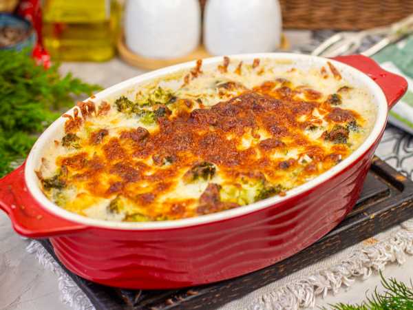 Залейте приготовленной заливкой. Отправьте брокколи и брюссельскую капусту в духовку, разогретую до 180 градусов, на 35-40 минут.