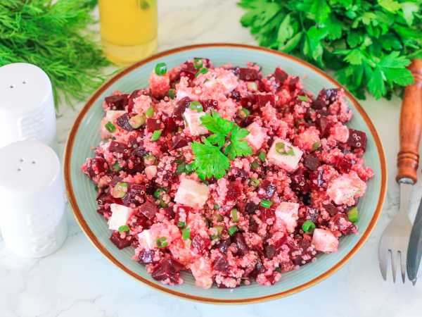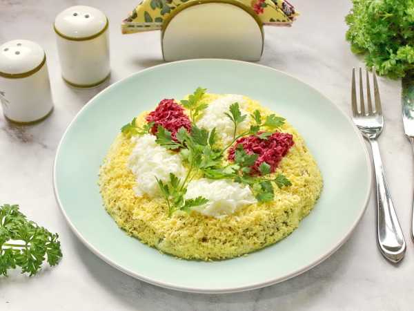 Наносим свекольный слой на верх салата, придавая ему полукруглую форму.