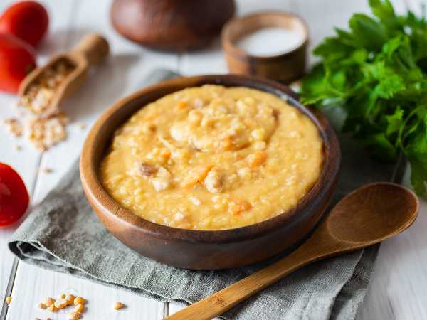 Горох хорошо промываем, заливаем водой и оставляем набухать на 12 часов. После замачивания горох ещё раз промываем и откидываем на дуршлаг, чтобы вода полностью стекла.