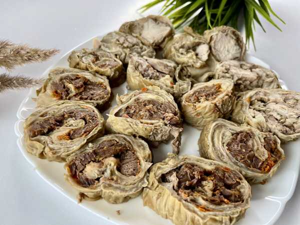 Оберните рулет в кулинарный пергамент. Поставьте в духовку на 1,5-2 часа при 180 градусах. В конце приготовления можно верх открыть, чтобы рулет немного подрумянился.