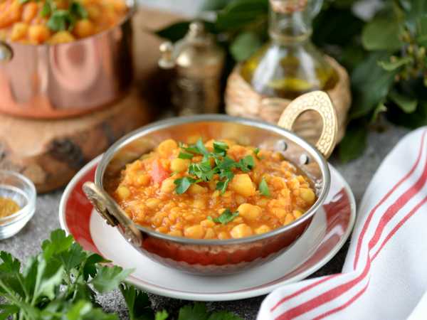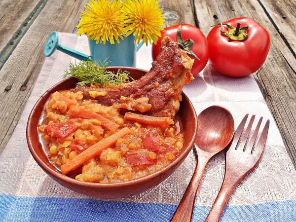 Чечевицу хорошо промойте накануне вечером, откиньте ее на сито, а затем пересыпьте в подходящую посуду и залейте водой. Оставьте при комнатной температуре на ночь. За это время чечевица немного набухнет. Откиньте чечевицу на сито и снова промойте.