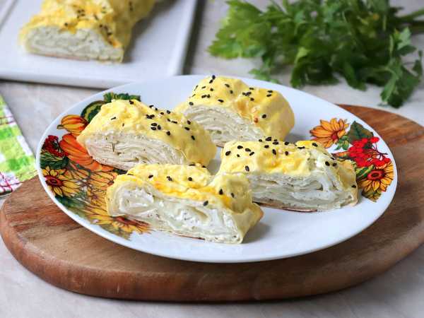 Аккуратно сверните тесто рулетом. Переложите штрудель на пергаментную бумагу. Смажьте сверху оставшимся растопленным сливочным маслом. Отправьте в предварительно разогретую духовку на 25–30 минут при температуре 200°C, до золотистой корочки.