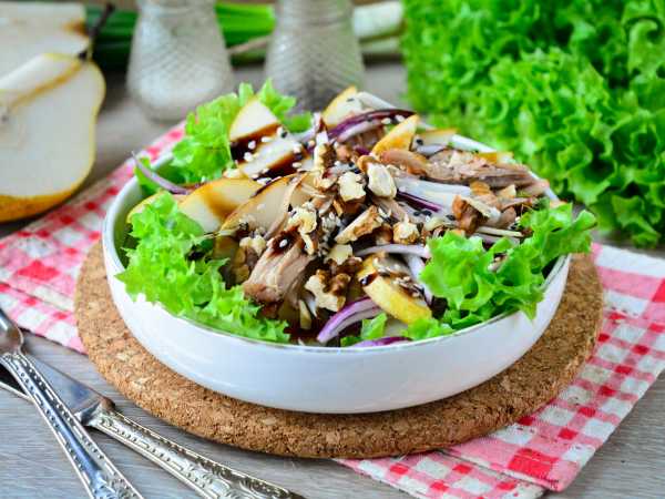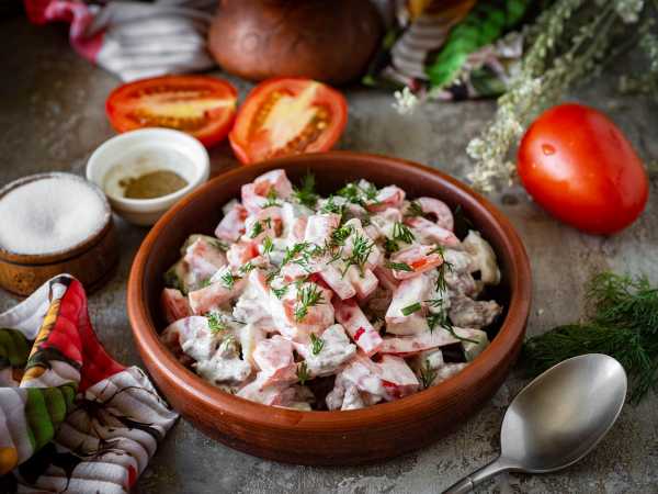 В салатник положите все нарезанные продукты, добавьте маринованный лук, мелко нарезанный чеснок.