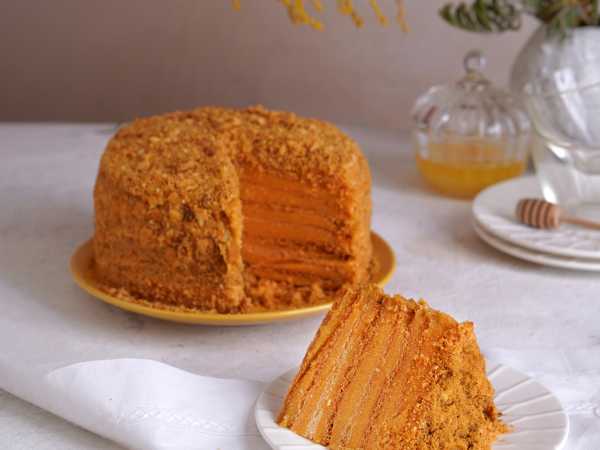 На седьмой корж уложите облепиховый курд. Поместите торт в холодильник на два часа. Из запеченных подсушенных обрезков сделайте крошку.