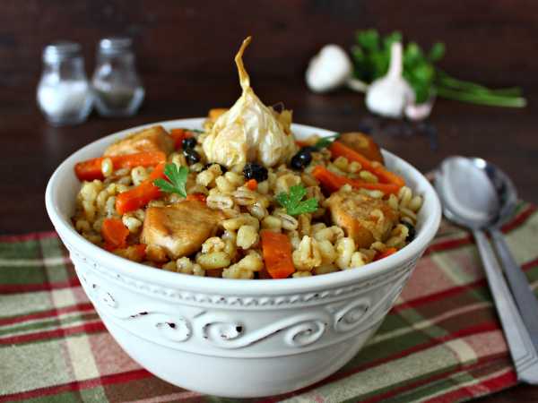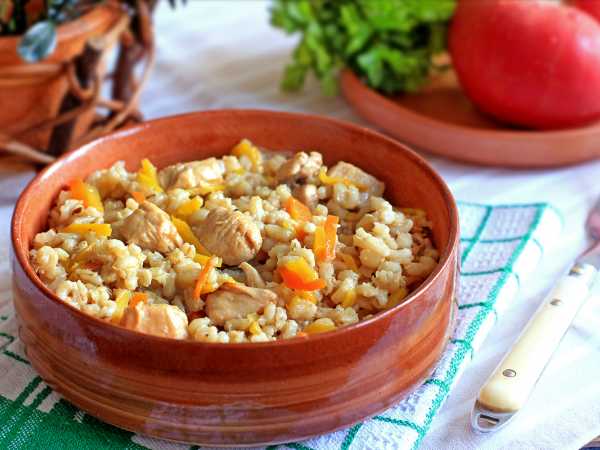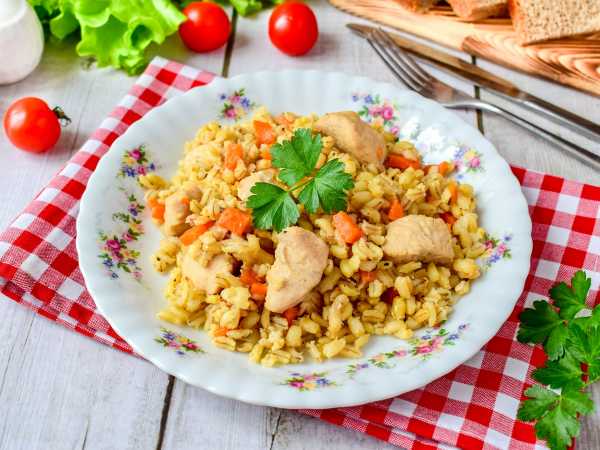 Готовить перловку с курицей мы будем на сковороде. Можно, конечно, крупу отварить отдельно, а потом добавить в сковороду к курице, но не советую. При длительной варке перловка напитается ароматами, каша получится еще вкуснее. Степень мягкости крупы вы можете контролировать самостоятельно. Мне нравится, когда перловка получается мягкой-мягкой, и зернышки ее буквально лопаются при надкусывании. Я добиваюсь такого результата благодаря длительной варке. Количество воды указываю в рецепте приблизительное, так как часто ее подливаю по мере выкипания.