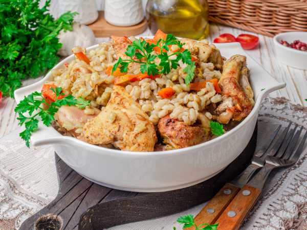 Снимите сковороду с плиты и плотно закутайте ее в полотенце или старый плед. Пусть перловая каша с курицей на сковороде еще попреет и постоит в тепле 10 минут. За это время вся каша хорошо пропитается ароматом специй.