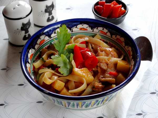 По текстуре это блюдо немного напоминает лагман - сочное, с ароматным соусом-подливой.