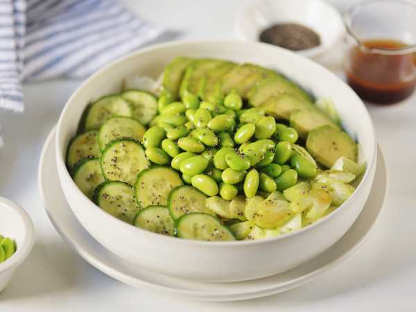 Соберите все ингредиенты для приготовления салата из авокадо с огурцом и яйцом.