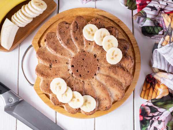 Готовый диетический пирог с бананами (ПП) охладите, украсьте ломтиками банана и подавайте к столу.