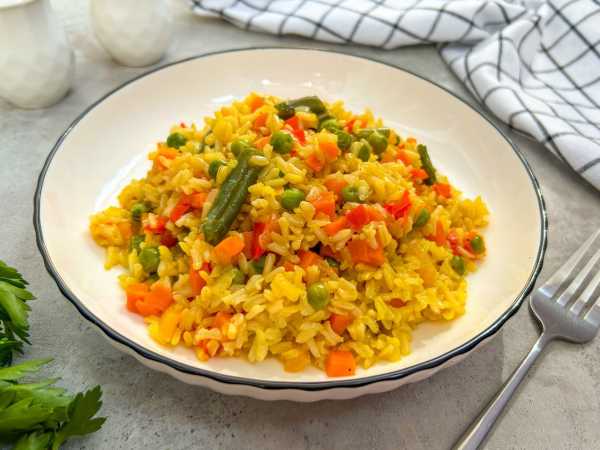 К этому времени рис уже будет готов. Добавьте его в сковороду, посолите, перемешайте и прогрейте еще 1-2 минуты.