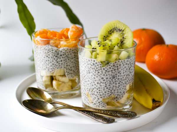 Продукты для приготовления постного чиа пудинга соберите по списку. Фрукты можно взять любые по вашему вкусу.
