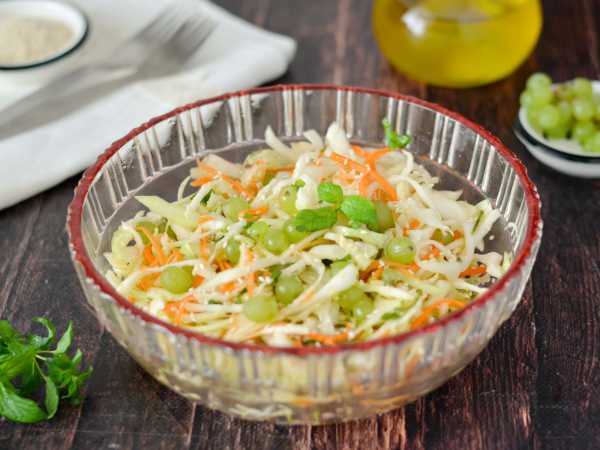 Пятый слой посыпьте ореховой крошкой и сверху разложите половинки винограда. Перед подачей дайте салату «Виноградинка» с курицей настояться 1-2 часа в холодильнике.