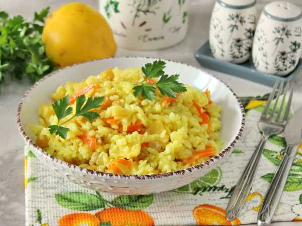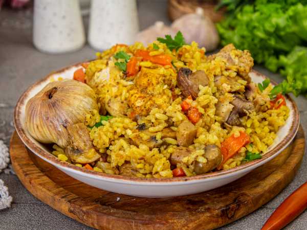 Готовим плов без крышки 10 минут на сильном огне. Затем немного собираем рис к середине и закрываем крышкой. Готовим 30 минут на слабом огне.