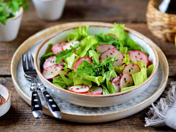 Перед вами весь набор ингредиентов, который необходим для приготовления салата из рукколы, мангольда и шпината.