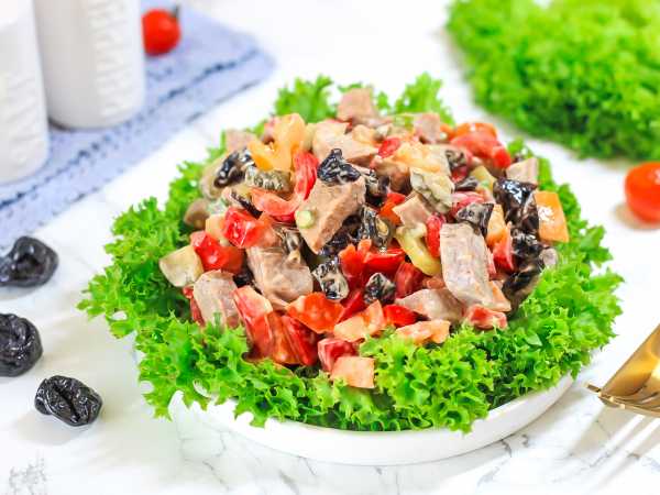 Возьмите на заметку и вариант приготовления салата слоями: язык, чернослив, майонез, огурец, сыр, зелень.