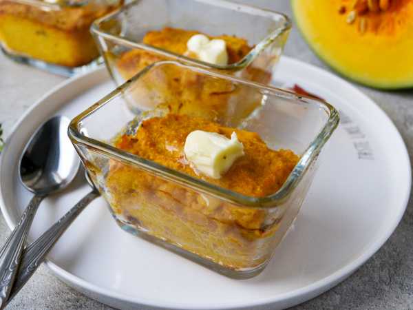 Выпекайте сырный пудинг при 170 градусах 35-40 минут. Готовый пудинг из творога и сыра остудите в форме и аккуратно переложите на блюдо.