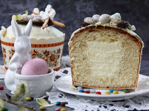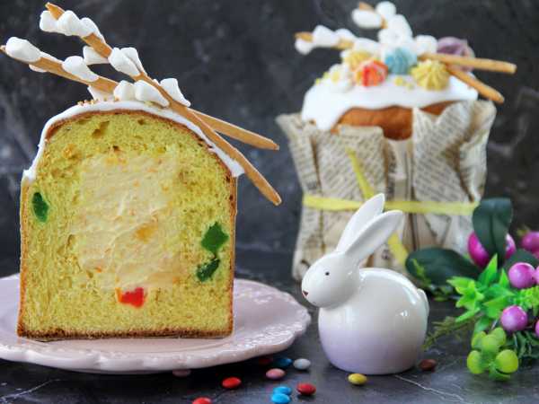 Аккуратно срежьте шапочки каждого кулича, из середины выньте мякиш и заполните фисташковой начинкой получившуюся полость. Верните шапочки на место (желательно точно состыковать срезы).