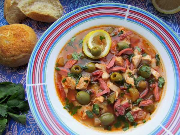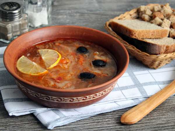 Доведите до кипения, уменьшите огонь до минимального. Добавьте маслины и лавровый лист, готовьте солянку еще 10 минут. Попробуйте на соль, при необходимости досолите. Дайте солянке настояться 10-15 минут.