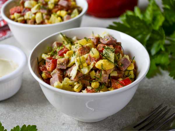 Смешайте все нарезанные продукты в глубоком салатнике. Заправьте майонезом.