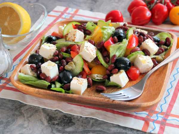 Фетаксу или фету нарежьте небольшими кусочками. Маслины разрежьте пополам и добавьте в салат.