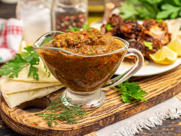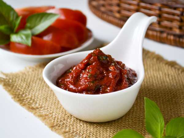 Подавать соус к шашлыкам в идеале холодным. Кстати, соус из помидоров с базиликом можно и на зиму закатать.