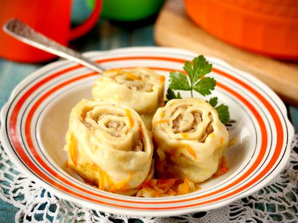 Отдохнувшее тесто разделим на две части. Каждую часть раскатываем в тонкий пласт, толщиной примерно 2 мм. Начинку тоже разделим на две части. На каждый пласт теста ровным слоем распределяем фарш, оставляем чуть теста без начинки с одного края.