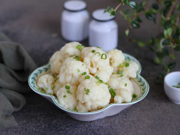Цветную капусту разделим на соцветия, поместим в кастрюлю, зальём водой, доведём до кипения, посолим и отварим под крышкой 8 минут.