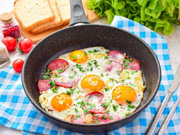 Жарьте яйца на небольшом огне примерно 5 минут. Если у яиц вам нравится более плотный желток, то подержите яичницу на плите чуть дольше, можно сковороду накрыть крышкой.