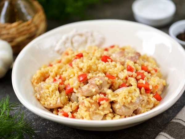 Затем насыпьте в сковороду макароны ризони. В течение 2-3 минут жарьте их с курицей перемешивая.