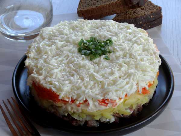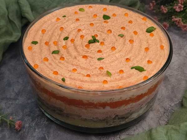 Собирается салат "Мимоза" слоями. Для этого можно использовать кулинарное кольцо или прозрачный салатник.