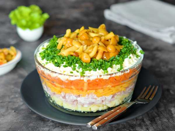 Салат "Лесная сказка" с опятами готов, и его можно подавать к столу.