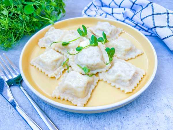 Для приготовления домашнего теста нужно соединить муку с теплой водой, замесить эластичное тесто и дать ему отдохнуть в пищевой пленке минут 30. Затем тесто тонко раскатать и вырезать заготовки круглой формы специальной вырубкой.