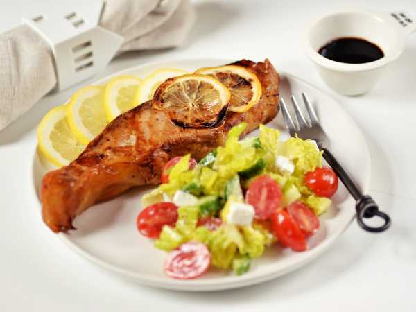 Спустя время картошка будет почти готова, сдвиньте ее в сторону, рядом положите осетрину и отправьте обратно в аэрогриль еще на 15-20 минут, но уже уменьшите температуру до 170 градусов. После сигнала проколите рыбу ножом: если вытекает абсолютно прозрачный сок или не вытекает вообще - она готова. Картофель за это время должен приготовиться абсолютно точно.