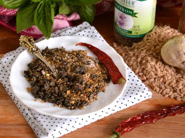 Сушеные листья мяты всыпьте в емкость, в которой вы будете заготавливать пряное масло. Добавьте пару щепоток соли, можно другие специи и пряности. По желанию масло можно прогреть на сковороде и влить его горячим - тогда вкус мяты будет ощущаться более явно и ярко.