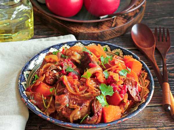 По дополнительным ингредиентам поясню так. Во-первых, это авторские или семейные традиции. Во-вторых, после тушения кусков мяса образуются просветы, в которые у многих так и просится по логике добавить между ними популярные корнеплоды.