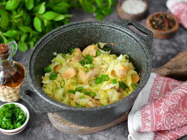 Тушим до мягкости капусты, периодически помешивая. Я воды не добавляла совсем, мне хватило сока от овощей. Как понять, что воды добавлять не нужно? Если ничего не пригорает, не образуется корочка на мясе, капусте - значит хватает собственной влаги для тушения. Если внизу продукты начинают покрываться корочкой, значит они уже жарятся, а не тушатся, в этом случае стоит добавить 0,5-1 стакана воды.