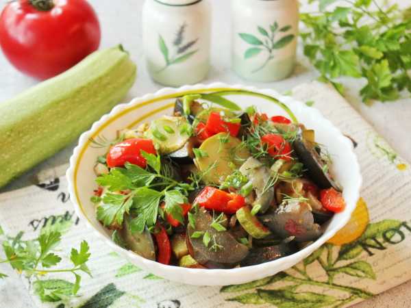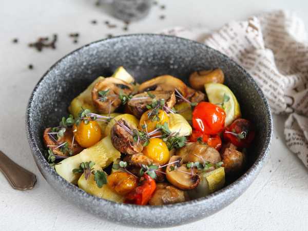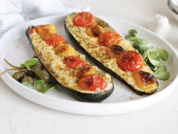 Сверху горкой выложите тертый сыр. Готовьте кабачки с помидорами в аэрогриле еще 5-7 минут при температуре 180-190 градусов, до румяности сыра.