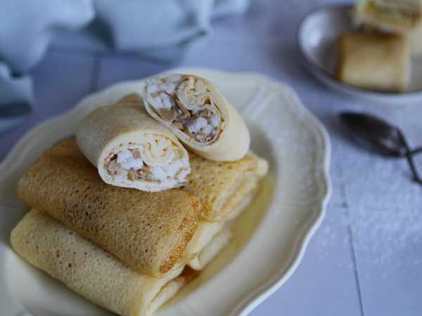 В центр блина выложите начинку - 1.5 ст.л. Сверните блин удобным для вас способом, конвертиком или в виде рулета.