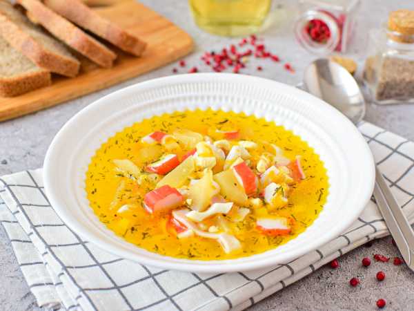 Соберите все необходимые ингредиенты для приготовления супа с крабовыми палочками и кукурузой.