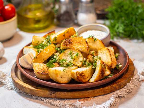 В чашу аэрогриля поместите кусочки хлеба на пергаменте.