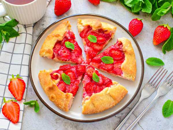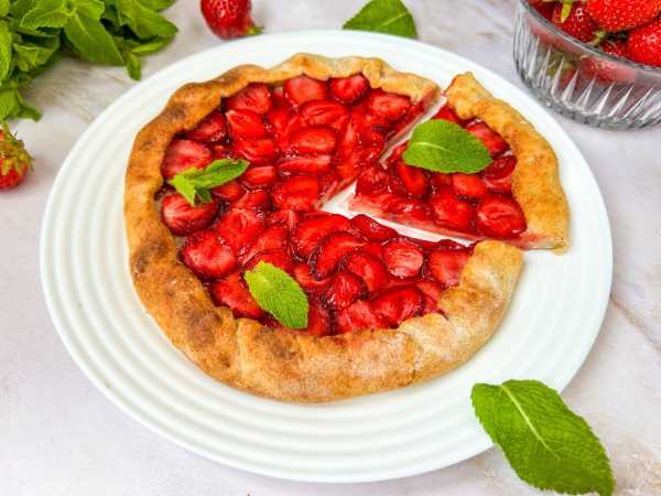 Готовая песочная галета с клубникой слегка подрумянится. Извлеките её из духовки и остудите. При запекании ягоды дали много сока, но за счет крахмала он не будет растекаться. Во время остывания начинка стабилизируется.