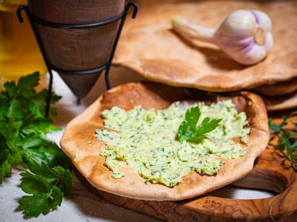 Произвольно по всей лепёшке сделать надавы, я делала деревянной ручкой скалки. Посыпать травами и, если есть, крупной солью.
