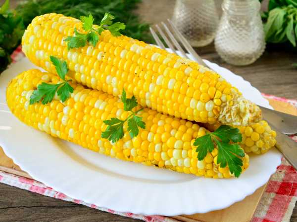 Поместите емкость на плиту и доведите ее содержимое до кипения, а затем убавьте нагрев до умеренного. Томите кукурузу на одном боку минуты 4-5, потом переверните на другой и т.д.