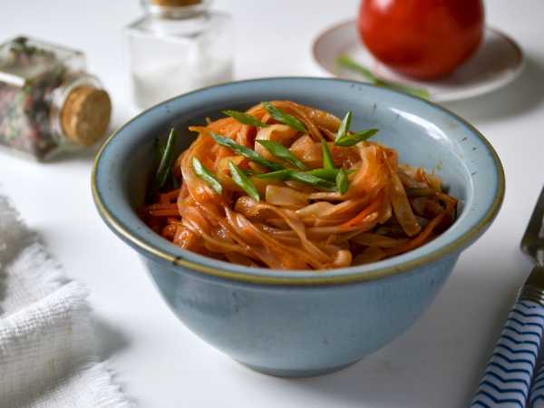 Макароны добавьте в сковороду к овощам и готовьте вместе 1 минуту.