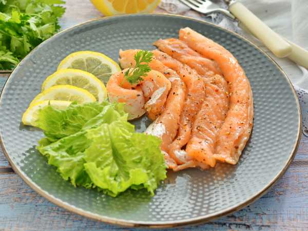 Пока все варится, займемся брюшками семги. Я срезала их самостоятельно с тушки семги, поэтому у меня они без чешуи, так как семгу я чистила. На рынке, как правило, брюшки семги продаются неочищенными от чешуи. Поэтому предварительно соскоблите чешую, промойте брюшки под проточной водой и затем нарежьте на небольшие кусочки.